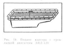Основанием всего двигателя служит картер, отливаемый вместе с блоком цилиндров. В картере имеются стенки, на которых размещаются коренные подшипники коленчатого вала. Эти подшипники для большинства двигателей выполняются тонкостенными, аналогично (латунным; наибольшую длину имеют задний и средний подшипники, как наиболее нагруженные (первый имеет нагрузку от маховика и заднего цилиндра, второй — от средних цилиндров). Штампованный поддон картера (рис. 19) закрывает нижнюю часть двигателя и используется в качестве резервуара для масла. Он штампуется из листовой стали и с прокладками при помощи болтов крепится к картеру.