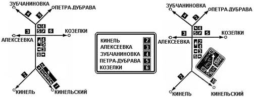 Рис. 1. Схема нумерации маршрутов в населенном пункте и оборудования их знаками. Указаны знаки, предназначенные только для водителей, в которые въезжают в населенный пункт с направления Кинельский: а- сеть маршрутов и их нумерация; б- знак, информирующий о принятой нумерации маршрутов (для схемы а, со стороны населенного пункта Кинельский); в - сеть маршрутов с одним сквозным маршрутом.