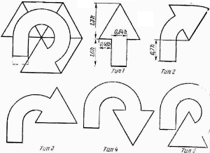 Горизонтальное расположение стрелки целесообразно применять на знаках, устанавливаемых на простых пересечениях в одном уровне (пересечение дорог под прямым иди близким к нему углом), а расположение под углом 45° - на знаках, устанавливаемых перед пересечениями в разных уровнях или перед перекрестками, где дороги пересекаются не под прямым углом. В последнем случае на знаках 6.9.2 и 6.10.1 в зависимости от планировки пересечения или реализуемой схемы движения могут быть использованы стрелки типов 2-5, общий принцип построения которых дан на рис. 13.