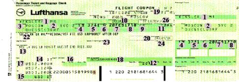 3. Полетный купон (бежевого или светло коричневого цвета). В билете может быть от одного до четырех полетных купонов. Наиболее распространенными в билете считаются два или четыре полетных купона.