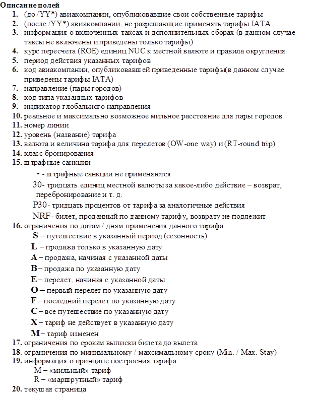 Если тариф построен по маршрутному (Routing), а не мильному принципу, в столбце «Принцип построения» (R) установлен индикатор R . Для вызова информации о допустимом по данному тарифу маршруте, наберите
