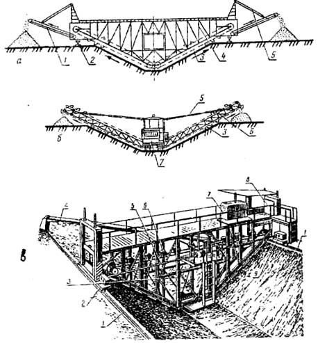 Рис. 13. Схема профілювальників каналів з двостороннім та одностороннім розвантаженням: а – з двостороннім розвантаженням, що рухається по берма двостороннім розвантаженням, що рухається по дну; 1 – транспорт і рейковий хід; 3 – ківшевий ланцюг; 4 – ферма; 5 – підвіска; 6 і рама; 7 – тягач; в – багатоківшевий профілювальних з розвантаженням грушу: 1 – рейка; 2 – ходовий візок; 3 – ферм і вальний транспортер; 5 – поперечні вали привода, б – лінія (ланцюги з ковшами); 7 – дизель-електрична установки, 8 – пульт керування; 9 – редуктор
