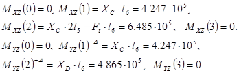 . Для определения опорных реакций при решении имеем 6 уравнений статики. Сумма моментов относительно опор в горизонтальной и вертикальной плоскости равна нулю и сумма сил на оси X и Y равна нулю. Причем
