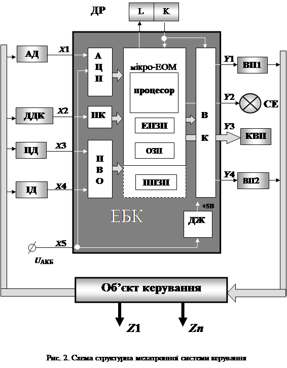 Автомобільні МП системи керування являють собою мехатронні системи, складовими яких є об’єкт керування, датчики вимірювальної інформації, виконавчі пристрої, електронний блок керування (рис.2.). Як об’єкти керування розглядаються механічні системи автомобіля: двигун, гальма, трансмісія, ходова частина та інші. Датчики утворюють вхідні електричні сигнали (структурні параметри), які характеризують миттєвий стан об’єкта керування. Вимірювальна інформація від датчиків надходить в ЕБК, в якому відбувається їх обробка та аналіз. ЕБК на підставі сигналів датчиків та інформації, що міститься у пам’яті МП, формує сигнали керування Y. Керування об’єктом здійснюється безпосередньо за допомогою виконавчих пристроїв (ВП), які перетворюють електричні сигнали керування на силові електричні, механічні та температурні впливи.
