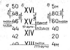 a — в дециметрах; б — в футах; в — другой вариант марок углублений в дециметрах