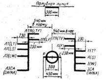 окружность диаметром 300 мм. Если грузовую марку наносят по Правилам Регистра, то по бокам круга наносят буквы «Р» и «С» высотой 115 мм и шириной 75 мм. На расстоянии 540 мм от центра круга (диска Плимсоля) в нос проводят вертикальную линию, а перпендикулярно ей —марки (горизонтальные линии длиной 230 мм, так называемую «гребенку»).