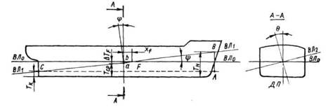 У судна, имеющего посадку с дифферентом, осадки носом Тн и кормой Тк различны. Разность осадок носом и кормой определяет дифферент судна: