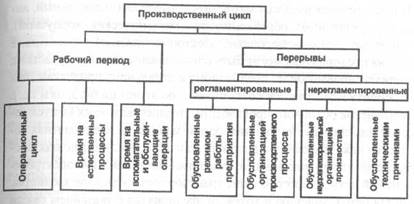 Длительностью производственного цикла называется интервал календарного времени от качала до окончания производственного процесса изготовления (ремонта) одного изделия или партии этих изделий. Производственный цикл имеет сложную структуру. В него включаются рабочий период и перерывы. В свою очередь рабочий период состоит из времени выполнения основных технологических операций с применением оборудования или ручного труда (операционный цикл), времени на естественные процессы, выполнение которых предусмотрено технологическим процессом (старение, сушка, остывание заготовок), времени на выполнение вспомогательных и обслуживающих операций (контрольных, транспортных).