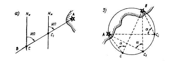 а — по радиолокационным расстояниям; б — по точечному ориентиру и ровной береговой черте