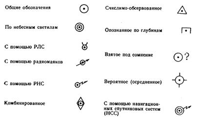 При визуальных способах определения места судна для наблюдений используют нанесенные на карту хорошо видимые и опознанные береговые и плавучие маяки, огни, неосвещаемые знаки, башни, церкви, а также различные естественные ориентиры: мысы, вершины гор, скалы и т.д. Не следует использовать для обсерваций буи, вехи и другие знаки плавучего ограждения, так как они могут быть снесены со своих штатных мест. Для указания на карте места судна, полученного по обсервациям, применяют условные обозначения: