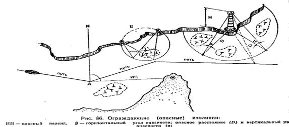 Надо помнить, что слепо полагаться на положение плавучих знаков нельзя, нужно подстраховывать их контрольными пеленгами, например, при каждом повороте. Для обеспечения безопасности плавания в узкостях, особенно в штормовых условиях нередко применяют метод ограничительных (опасных) изолиний . Чаще применяют ограничительный пеленг. Для этого от хорошо видимого ориентира проводят на карте линию пеленга, ограничивающую опасность (рис. 4). При проходе мимо этой опасности следят, чтобы пеленги на этот ориентир были больше (меньше) ограждающего пеленга.