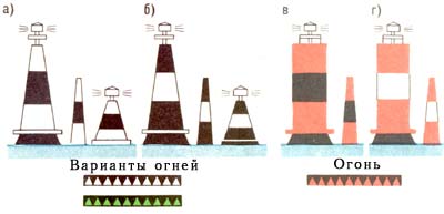 У ходовых знаков огни цветные и однопроблесковые: справа - красные, слева - зеленые. У весенних знаков - тоже цветные, но постоянные.