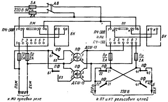 Рис.15.Схема включения питающих устройств фазочувствительных рельсовых цепей 25Гц с реле ДСШ-13.