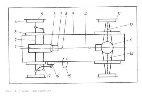 Современный автомобиль относится к сложным машинам. Количество деталей автомобиля измеряется тысячами. Тем не менее у большинства ав-томобилей принципы устройства и действия их элементов, а также общая схема одинаковы. Поэтому для облегчения изучения устройства автомобиля можно воспользоваться некоторым условным упрощением как в соответст-вующих схемах всего автомобиля, так и его элементов.