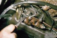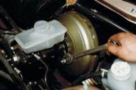 Вакуумный усилитель 5 расположен между педальным узлом и главным тормозным цилиндром 1 и крепится к кронштейну педального узла на двух шпильках. Усилитель – неразборной конструкции, при выходе из строя его следует заменить. Простейшая проверка исправности усилителя: на автомобиле с заглушенным двигателем несколько раз нажимаем на педаль тормоза и, удерживая педаль нажатой, запускаем двигатель. При исправном усилителе с началом работы двигателя педаль должна уйти вперед. Отказ в работе или недостаточная эффективность вакуумного усилителя могут быть также вызваны негерметичностью шланга, отбирающего вакуум от впускного коллектора.