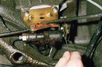 Регулятор давления задних тормозов 10 крепится двумя болтами к кронштейну в левой задней части кузова. Один из этих болтов (передний) также крепит вильчатый кронштейн рычага привода регулятора давления 11. За счет овальности отверстий для его крепления кронштейн вместе с рычагом можно перемещать относительно регулятора давления, изменяя усилие, с которым рычаг действует на поршень регулятора. С увеличением нагрузки на заднюю ось автомобиля упругий рычаг также нагружается, передавая усилие на поршень регулятора давления. При нажатии на педаль тормоза давление жидкости стремится выдвинуть поршень наружу, чему препятствует усилие со стороны упругого рычага. Когда система приходит в равновесие, клапан, расположенный в регуляторе, изолирует задние тормозные цилиндры от главного тормозного цилиндра, не допуская дальнейшего роста тормозного усилия на задней оси и препятствуя опережающей блокировке задних колес по отношению к передним. При увеличении нагрузки на заднюю ось, когда сцепление задних колес с дорогой улучшается, регулятор обеспечивает большее давление в колесных цилиндрах и наоборот – с уменьшением нагрузки давление падает. В корпусе регулятора имеется отверстие, закрытое заглушкой. Подтекание тормозной жидкости из этого отверстия говорит о негерметичности уплотнительных колец регулятора.