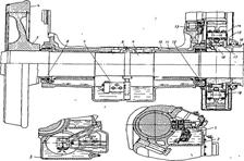 1,21- трубки для добавления смазки а подшипники якоря; 2, 17 - крышки подшипника; 3,19-подшипники роликовые; 4 -упорное кольцо; 6,16- малый и большой подшипниковые щиты; 7 -коллектор; 8 - щеткодержатель; 9 - якорь; 10- обмотка якоря; 11, 15- стеклобандажи; 12 - сердечник якоря; 13, 14 - добавочный и главный полюсы; 18- лабиринтное уплотнение; 20 - свободный конец вала; 22- вкладыши моторно-осевого подшипника; 23 - корпус моторно осевого подшипника; 24 -механизм смазывающего фитиля моторно-осевого подшипника; 25 - остов.