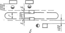 а — расстояния между колонной, ванной для очистки в препарате АМ-15 и между ваннами по фронту: б — расстояния между колонной, разборочно-сборочным стендом и между стендами, расположенными «в затылок» или по фронту.