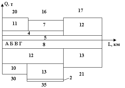 Грузопотоки оформляются в виде эпюр и схем. Эпюры характеризуют общее перемещение грузов на предприятии, напряженность грузопотоков, их направление . Они также помогают выявить нерациональные встречные перевозки, т.е. перевозки одинакового груза во встречных направлениях. Построение эпюры, как это показано на рис. 2.5.1, начинается с грузопотока, следующего в наиболее удаленный от отправителя пункт (в нашем случае вначале откладывается количество груза, следующего из А в Г, затем из Б в Г и т.д.).