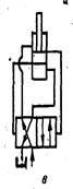Рис. 8 Схема роботи вібратора при нижньому (а) і верхньому (б) положеннях та умовне позначення на принципових схемах (в): 1, 24 —нижня і верхня .порожнини корпуса; 2, 7 і 15—внутрішні кільцеві виточки поршня; 3 — золотник; 4 — поршень; 5 і 19 — косі отвори; 6 і 8 — отвори для зливання і підведення масла; 9 і 21 — наскрізні радіальні отвори поршня; 10 і 20 — кільцеві виточки золотника, 11— радіальний отвір поршня; 12 — пружина; 13 — шток 14 — корпус; 16 і 18 — кільцеві виточки поршня;17 зовнішня кільцева виточка поршня; 22 — радіальний отвір золотника; 23 — осьовий канал золотника.