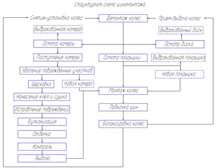 2. Технологическую часть, в которой представлены структурные схемы технологических процессов шиномонтажа, ремонта топливной апаратуры дизельных двигателей грузовых автомобилей с подбором соответствующего оборудования и инструмента.