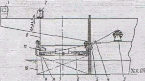 6 — канат; 7 — грузозахватиое устройство: 8 — переносивв клюз; 9—кнехт лихтера: /О—ляхгер; II— направляющий клюз