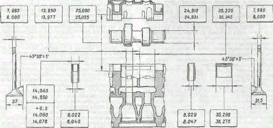 Рис. 3.1. Основные размеры головки цилиндров и деталей механизма привода клапанов.