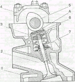 1 - головка цилиндров; 2 - клапан; 3 - толкатель; 4 - корпус подшипников распределительного вала; 5 - распределительный вал; 6 - регулировочная шайба; 7 - маслоотражательный колпачок; А - зазор между кулачком и регулировочной шайбой.