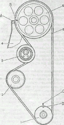 1 - зубчатый шкив коленчатого вала; 2 - зубчатый шкив насоса охлаждающей жидкости; 3 - натяжной ролик; 4 - задняя защитная крышка; 5 - зубчатый шкив распределительного вала; 6 - зубчатый ремень; А - установочный выступ на задней защитной крышке; В - метка на шкиве распределительной вала; С - метка на крышке масляного насоса; D - метка на шкиве ремня шкиве коленчатого вала.