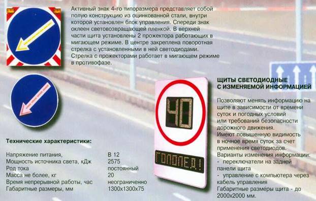 Основное свойство таких знаков: позволяют менять информацию на щите в зависимости от времени суток и погодных условий. Имеют отличную видимость в ночное время суток и в туманную погоду - за счет применения светодиодов. Варианты контроля изменения информации: