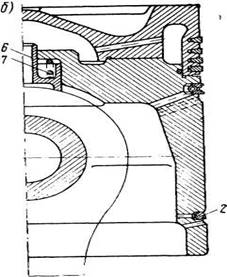 а - до модернизации; б - модернизированный повышенной газоплотности; 1-тронк; 2-кольца маслосъёмные; 3-кольцо торсионное; 4-кольца компрессионные; 5-головка; 6-стакан; 7-пружина.