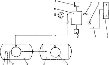 Рис. 2 Принципова схема наповнення автомолокоцистерни: 1 – запобіжний клапан; 2 – зворотний клапан; 3 – пробковий кран; 4 – впускний трубопровід двигуна; 5 – повітропровід; 6 – заглушка для зливу; 7 – піногасій; 8, 9 – секції; 10 – молокопровід; 11 – внутрішній клапан; 12 – мановакуумметр; 13 – рідиновідділювач
