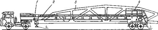 Рис. 4 Схема автопоїзда-фермовоза: 1 – лебідка; 2 – рама; 3 – залізобетонна ферма; 4 – мостик; 5 – задній візок 6 – опора