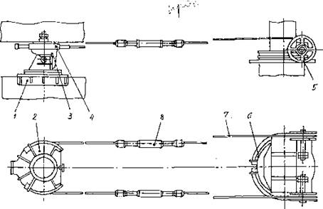 Рис. 5 Схема приводу напівпричепа-фермовоза ППФ-24: 1 – опорна плита; 2 – ведучий блок; 3 – упори; 4 – шкворень; 5 – проміжний блок; 6 – верхній ведений блок; 7 – тросові тяги; 8 – гвинтова стяжка