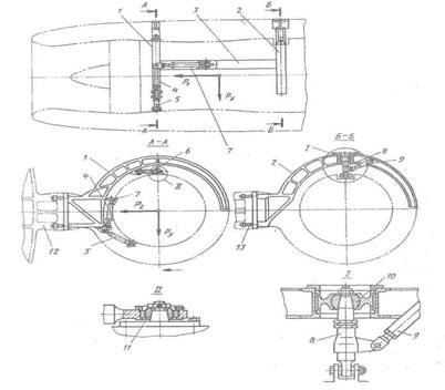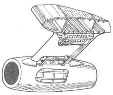 2 — силовые шпангоуты гондолы; 3— продольная балка; 4, 5, б — подкосы передней плоскости крепления двигателя; 7— продольный подкос; 8, 9—подкосы задней плоскости крепления двигателя; 10 — шаровой шарнир заднего крепления; Il — шаровой шарнир креп ления подкоса к цапфе двигателя; 12, 13 — узлы крепления силовых шпангоутов гондолы к фюзеляжу. Конструкция, непосредственно закрывающая двигатель, называется капотом. Гондолы должны обеспечивать удобный доступ к двигателю и агрегатам, расположенным на нем, для осмотра, замены и технического обслуживания. Для этого они имеют системы легко-съемных или откидных крышек. Гондолы двигателей представляют собой тонкостенные конструкции, аналогичные конструкции фюзеляжа.