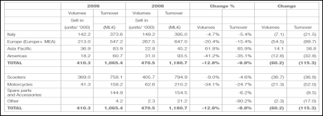 Огромный выбор пятидесяти-кубовой техники самого разного назначения предлагает итальянский концерн Piaggio - под марками Aprilia, Derbi, Gilera, Vespa и собственно Piaggio. Благодаря руководству компании Piaggiо, которое любезно предоставило свой годовой финансовый отчет, видно, что объем продаж в 2009 году сократился по сравнению с 2008-м на 9%, а товарооборот на 4,6%. Говорит это о том, что кризис никого не обошел стороной, и его влияние на спавшие объемы продаж очевидны.