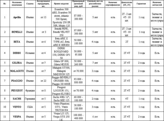 Таблица приведенная ниже отражает основных европейских производителей скутерной техники, цены на их продукцию и прочие показатели.