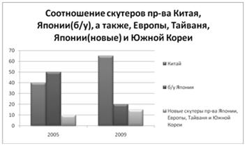 Конечно, по качеству китайские товары уступают продукции, изготовленной в Европе или Японии. Но не так сильно, как мы привыкли думать. Да и если бы цена была единственным аргументом в пользу китайских производителей, вряд ли бы их товары получили сегодня такое распространение. Как ни печально это констатировать, но реальность такова, что товары именитых производителей становятся все хуже и хуже, а срок их службы катастрофически снижается. И дело здесь не только (и не столько) в том, что они собираются в Китае, Тайване и Малайзии, а скорее, в общей политике, исповедуемой большинством производителей, на ускорение ротации товара. Компаниям просто невыгодно, если вы купите себе один телевизор, и будете смотреть его ближайшие 20 лет. Производителям телевизоров нужно, чтобы через 2-3 года вы пошли покупать новый. Не стал исключением и мото-рынок. Как показывает практика, покупая товар китайского производства, вы можете и не почувствовать существенной разницы, а экономия будет ощутимой. И конечно, важно отметить, что рынок китайских скутеров стал более цивилизованным. Если два года назад китайские скутеры привозили в Россию непонятные личности, то сегодня появляются официальные представительства китайских компаний, открываются сервисные центры, растет комплекс сопутствующих услуг. Если приплюсовать к новым китайцам, новых европейцев, японцев, тайваньцев и корейцев, процент которых за последние годы также вырос, то мы сможем говорить о начале формирования рынка НОВЫХ скутеров, который до последнего времени находился в зачаточном состоянии. Очевидно, что именно рынок новых скутеров будет расти, вытесняя б/у технику. Об этом говорит приведенный ниже график, основанный на данных компании Скутер Дайджест.