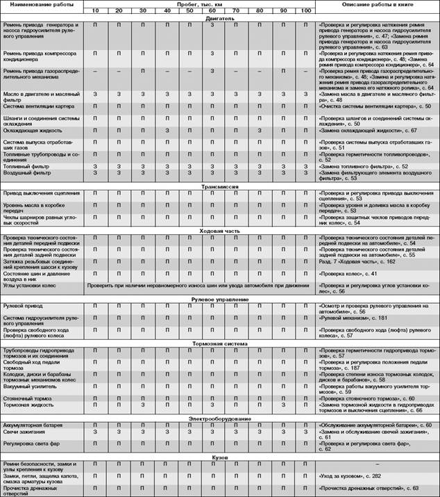 П - проверка (при необходимости замена/доливка/регулировка/смазка);