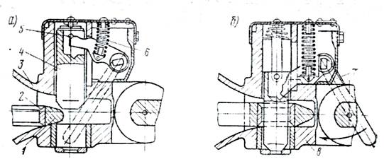 Рис.2. Полуавтоматическое тягово-сцепное устройство автомобиля Татра-Ш: а - положение затвора перед сцепкой; б - положение затвора после сцепки.