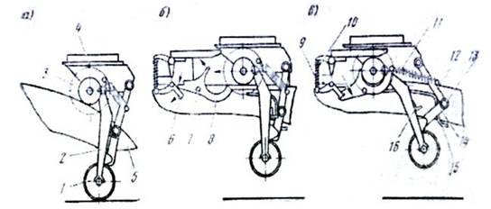 из фиксатора 16, прикрепленного к опорным стойкам 2 изогнутой планкой 15 (рис.4. в). При дальнейшем поднятии опорных стоек пружина 11 запорного механизма опорного устройства растягивается, верхние части запорных крюков 8 упираются в направляющие ролики и, вращаясь вокруг осей 7, поворачиваются против часовой стрелки, пока передняя часть запорного крюка, преодолев сопротивление пружины 10, не повернет вниз фиксатор 6. В это время направляющие ролики захватываются крюками 8, которые заперты фиксаторами 6, и автопоезд готов к движению. Прибыв к месту назначения, водитель посредством выведенной в кабину тяги 9 освобождает фиксаторы и подает автомобиль-тягач вперед. Направляющие ролики полуприцепа скатываются по направляющим автомобиля-тягача, пружина 11, сжимаясь, поворачивает рычаги 12 и 14. которые опускают стойки в вертикальное положение, при этом шарнир 13 попадает в фиксатор 16 (см. рис.4. б). По описанной выше схеме работает большинство автоматических бесшкворневых устройств.