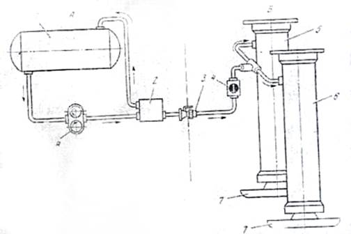 Рис.5. Схема опорных устройств полуприцепа с гидравлическим приводом: А - автомобиль-тягач; Б - полуприцеп:1-маслянный бак.2 - блок клапанов; 3 - соединительная головка; 4 - запорный вентиль; 5-6 - цилиндры опорных устройств; 7 - опорные плиты; 8 - насос.