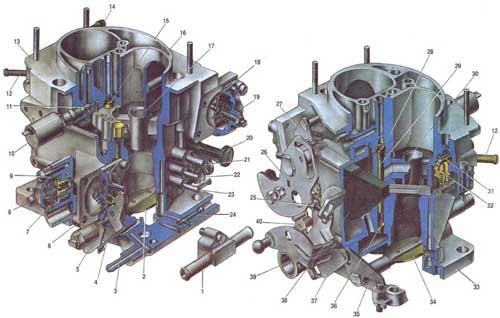1. Блок подогрева карбюратора; 2. Дроссельная заслонка первой камеры; 3. Патрубок отсоса картерных газов; 4. Рычаг привода ускорительного насоса; 5. Кулачок привода ускорительного насоса; 6. Диафрагма ускорительного насоса; 7. Топливный жиклер экономайзера мощностных режимов; 8. Корпус карбюратора; 9. Диафрагма экономайзера мощностных режимов; 10. Электромагнитный запорный клапан; 11. Топливный жиклер холостого хода; 12. Патрубок слива топлива в бак; 13. Крышка карбюратора; 14. Патрубок подачи топлива; 15. Главный воздушный жиклер первой камеры; 16. Воздушная заслонка; 17. Распылители ускорительного насоса; 18. Диафрагма пускового устройства; 19. Регулировочный винт пускового устройства; 20. Регулировочный винт количества смеси холостого хода; 21, 22. Патрубки отбора разрежения в систему рециркуляции отработавших газов; 23. Патрубок отбора разрежения к вакуумному регулятору распределителя зажигания; 24. Регулировочный винт качества смеси холостого хода; 25. Регулировочный винт приоткрывания дроссельной заслонки первой камеры; 26. Рычаг управления воздушной заслонкой; 27. Рычаг воздушной заслонки; 28. Главный воздушный жиклер второй камеры; 29. Эмульсионная трубка; 30. Распылитель главной дозирующей системы второй камеры; 31. Топливный фильтр; 32. Игольчатый клапан поплавковой камеры; 33. Корпус карбюратора; 34. Дроссельная заслонка второй камеры; 35. Рычаг дроссельной заслонки второй камеры; 36. Главный топливный жиклер второй камеры; 37. Рычаг привода дроссельной заслонки второй камеры; 38. Поплавок. 39. Рычаг привода дроссельных заслонок; 40. Рычаг блокировки второй камеры.