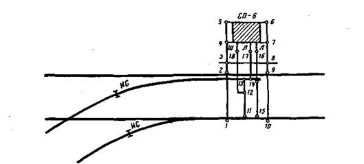 Стрелочный электропривод СП-6 (рис.2) устанавливается на двух фундаментных угольниках 1-5 и 6-10, прикрепленных в узлах (болтовые соединения) 1, 2 и 9, 10 к рамным рельсам, а в узлах 4, 5 и 6, 7 - к корпусу привода. Для придания конструкции большей жесткости и снижения колебаний привода в вертикальной плоскости при динамическом режиме фундаментные угольники скреплены дополнительно в узлах 3, 8 продольной связной полосой, опирающейся на стрелочные брусья. Рабочий шибер Ш привода шарнирно (шарнир Гука, узел 18) связан с рабочей тягой 12-18, которая в узле 12 прикреплена к межостряковой (соединительная) тяге 11-13, а последняя - к острякам. Контрольные линейки Л в узлах 16, 17 шарнирно связаны с контрольными тягами гарнитуры, которые жестко прикреплены к стрелочным острякам в узлах 14, 15. Чтобы предотвратить шунтирование электрической рельсовой цепи элементами стрелочной гарнитуры, в узлах 1, 2, 9-11, 13-15 устанавливают изолирующие фибровые прокладки и втулки.