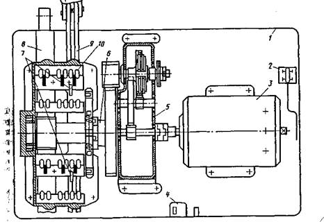 В корпусе 1 привода СП-6 (рис.3) расположены электродвигатель 3 постоянного или переменного тока, редуктор 5 со встроенным в том же блоке фракционным устройством в виде стальных дисков, сжатых пружиной, блок автопереключателя 10, главный вал 6, шибер 8 с кулачковым запирающим механизмом, контрольные линейки 9, штепсельная розетка 4 для подключения переносной осветительной лампы, обогреватели (резисторы) контактов автопереключателя 7, контактное блокировочное устройство 2, управляемое заслонкой (рычаг), которое отключает цепь электродвигателя 3 при переводе стрелки курбельной рукояткой и снятии крышки корпуса 7.