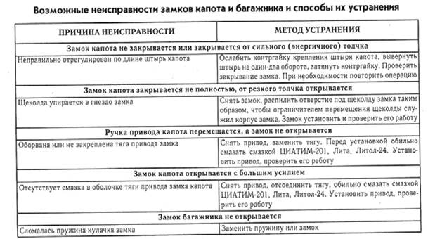 Для открывания замка капота изнутри автомобиля предназначен привод замка, расположенный снизу под панелью приборов, слева от рулевой колонки. Если рукоятку привода потянуть на себя, то за счет тяги привода щеколда замка переместится до упора, а капот под действием пружины штыря приподнимается, т. е. замок капота откроется. После этого ручку привода необходимо вернуть вперед до упора, т. е. щеколду вернуть в исходное положение, и замок опять готов к работе