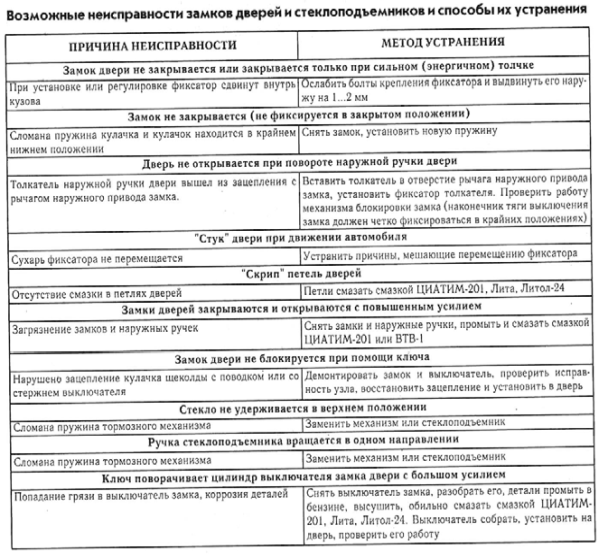 Вce четыре двери могут быть заперты изнутри кнопочным выключателем, расположенным в нижней части оконного проема, для чего следует надавить кнопку вниз. При этом двери нельзя открыть ни оттяжкой наружной ручки, ни оттяжкой ручки изнутри. Задние двери можно запереть снаружи, для чего следует опустить кнопку и захлопнуть дверь. Передние двери снаружи можно запереть только ключом.