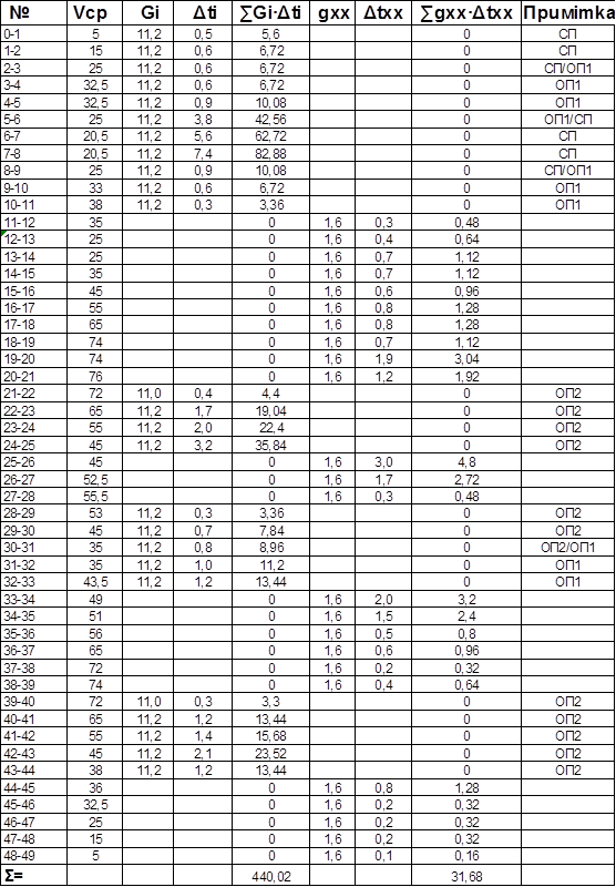 Таблиця 7.1-Визначення часу ходу поїзда приблизним способом