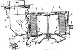Воздушный фильтр (рис.2) двухступенчатый, сухого типа, с инерционной решёткой, автоматическим отсосом пыли и сменным бумажным элементом. Воздушный фильтр состоит из корпуса, фильтрующего элемента и крышки. Фильтр прикреплен винтом 6 к воздухопроводу 10 и кронштейну 11, установленному на впускной трубе. Соосность воздухозаборника с отверстием в капоте обеспечивается при условии совмещения метки на корпусе фильтра с осью болта крепления фильтра (метка на корпусе может быть нанесена краской). Для обеспечения герметичности между крышкой и корпусом установлено уплотнительное кольцо. Верхняя крышка прикреплена к корпусу четырьмя защелками. Воздух через входной патрубок попадает для предварительной очистки в первую ступень с инерционной решеткой. В результате резкого изменения направления потока воздуха в инерционной решетке крупные частицы пыли отделяется п. под действием вакуума в патрубке, соединенном с эжектором глушителя, выбрасывается в атмосферу. Предварительно очищенный в первой ступени воздух поступает во вторую ступень с бумажным фильтрующим элементом для более тонкой очистки. Проникая через поры фильтрующего элемента, воздух оставляет на его поверхности мелкие частицы пыли. Окончательно очищенный воздух через трубопроводы поступает в цилиндры двигателя. В системе питания двигателя воздухом применен индикатор засоренности воздушного фильтра, установленный на впускном трубопроводе. По мере засорения фильтра растет вакуум во впускном трубопроводе. При достижении величины вакуума 0,007 МПа (0,07 кгс/см*) индикатор срабатывает, при этом в его смотровом окне появляется красный участок барабана, который остается в таком положении и после остановки двигателя. При срабатывании индикатора следует немедленно обслужить воздушный фильтр.