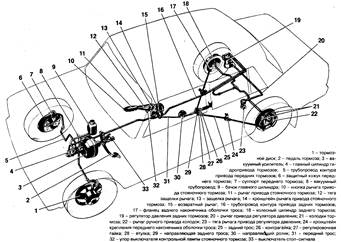 Гидравлический привод тормозов состоит из двух независимых контуров (систем) торможения передних и задних колес. Поэтому бачок имеет две емкости для тормозной жидкости, а в главном цилиндре сделаны две независимые полости с двумя поршнями. Две независимые системы введены для безопасности: в случае повреждения одной из них (утечка жидкости или повреждения трубопровода), вторая остается в действии. Имеющийся в системе привода задних проводов регулятор давления уменьшает вероятность блокировки колес при торможении.